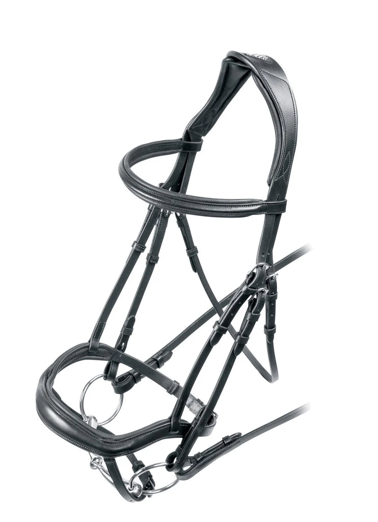 Offering next level freedom and comfort, this Velociti curved flash bridle has been ergonomically designed to avoid the sensitive facial nerves. The unique flash position inhibits evasion of the bit without impeding free flow of air to the nose, promoting unrestricted breathing. Tech details: FreedomFit headpiece designed to relieve pressure thanks to the wide, cushioned crown with poll gap and cutaway ear profile; soft leather combined with generous, anti-shock padding on the headpiece, browband and noseband; elegant profile due to sleek, angled throatlash; high shine stainless steel harness buckles; signature Velociti reins for flexible and assured grip.
