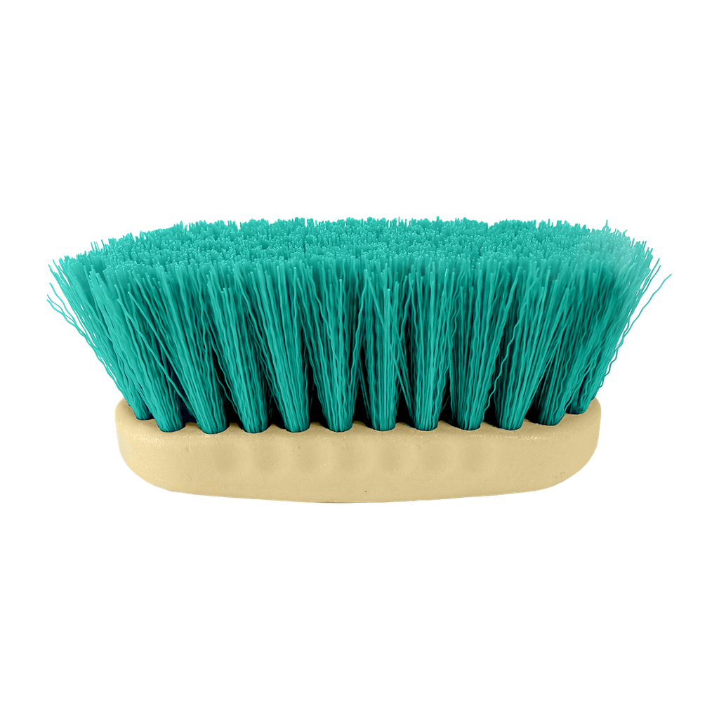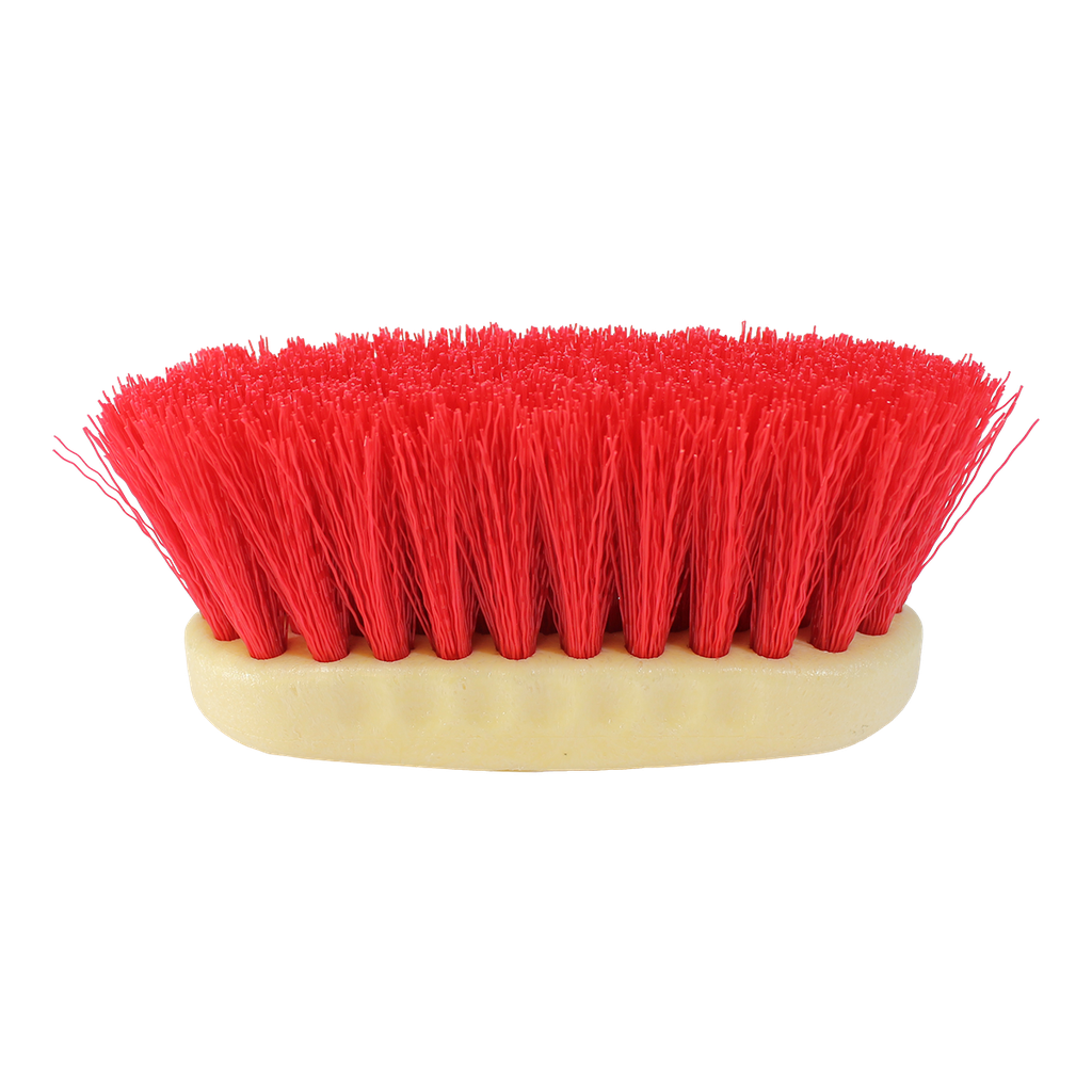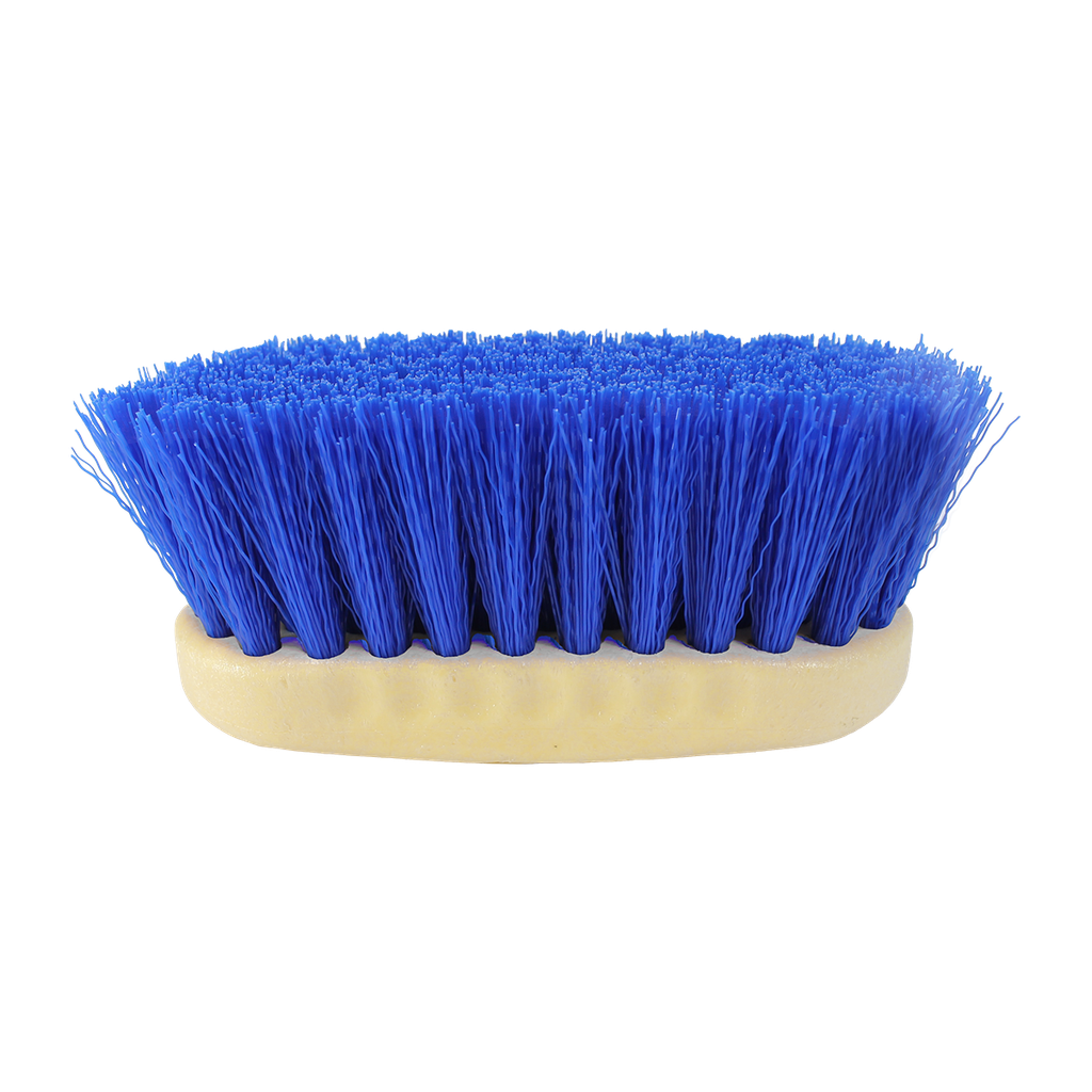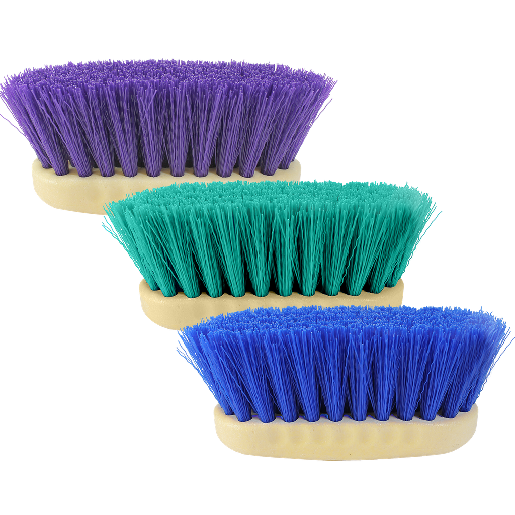 A small Dandy brush with softer bristles that is used to remove the dirt, hair and other material stirred up by the curry. Brushes are used in the direction of the horse's hair coat growth, usually in short strokes from front to back, except at the flanks, where the hair grows in a different pattern.