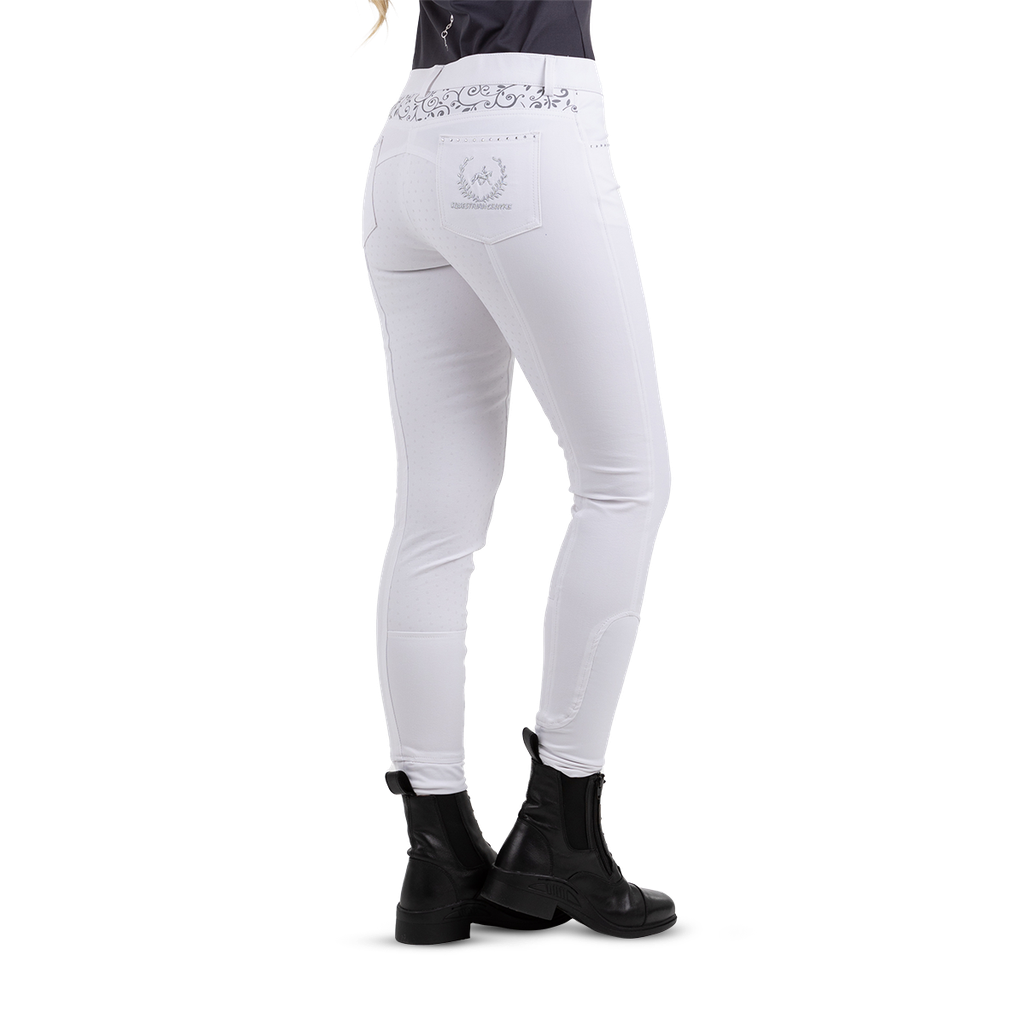 Stand out in the arena with the eye-catching pattern adorning the back of these breeches, accentuated by slanting front pockets and elegant belt loops. But it's the thoughtful details that truly set these breeches apart. Both front and back pockets are adorned with sparkling crystals, while a silver embroidery on the right back pocket adds a touch of sophistication.