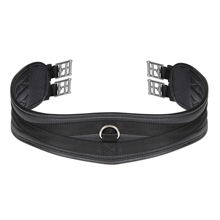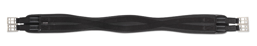 Synthetic contour girth with double layer elastic inserts at both ends to even pressure and prevent pinching. This durable girth is lined with anti-chafe cushion fabric – a textured surface that increases airflow to help reduce excessive sweat build up and protect against chafing. Shaped for freedom around the elbows.
